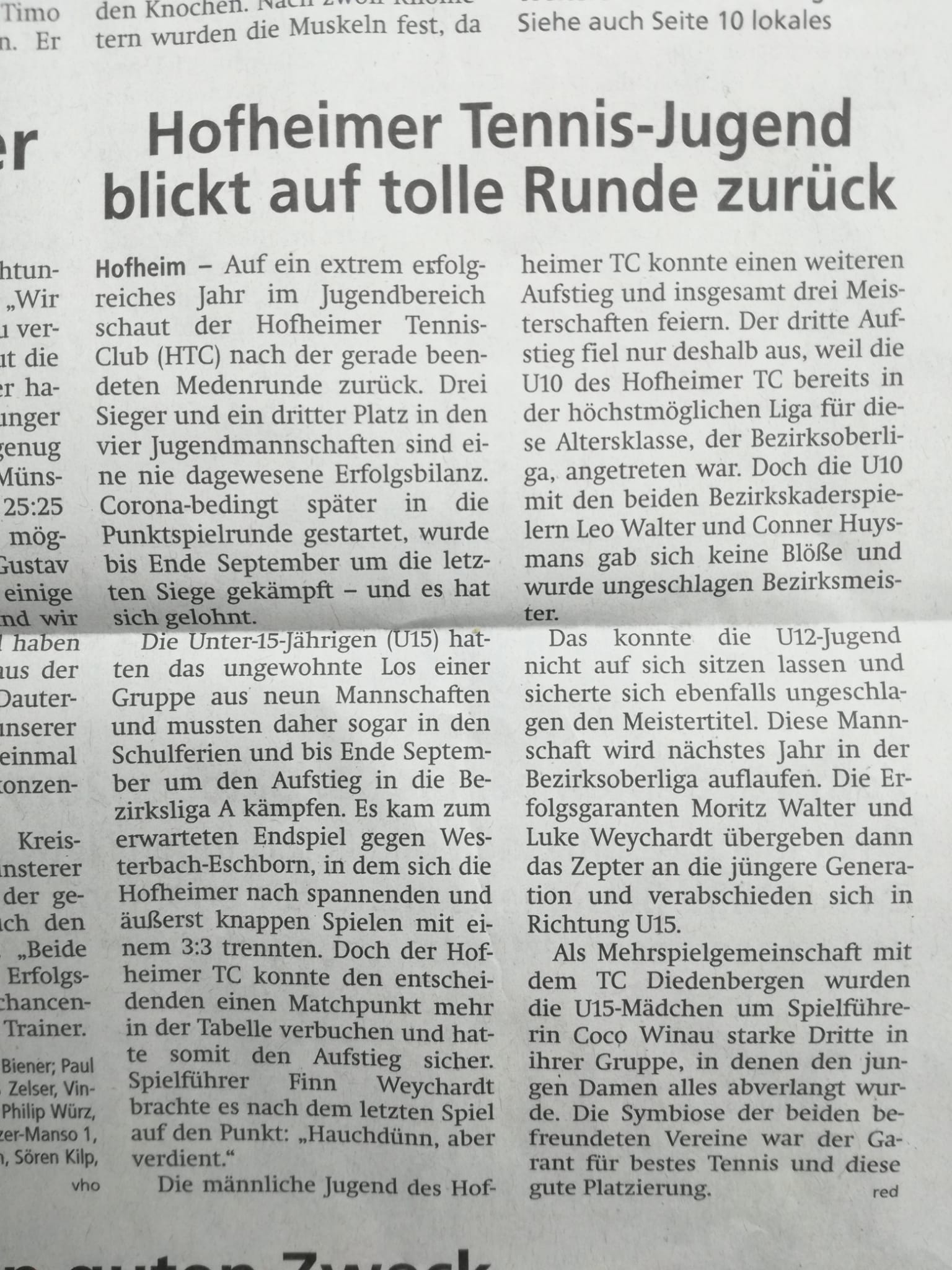 Auf ein extrem erfolgreiches Jahr im Jugendbereich schaut der Hofheimer Tennis-Club (HTC) zurück: Drei Sieger und ein dritter Platz in den vier Jugendmannschaften sind eine nie dagewesene Erfolgsbilanz. Coronabedingt später in die Punktspielrunde gestartet, wurde bis Ende September um die letzten Siege gekämpft - und es hat sich gelohnt!