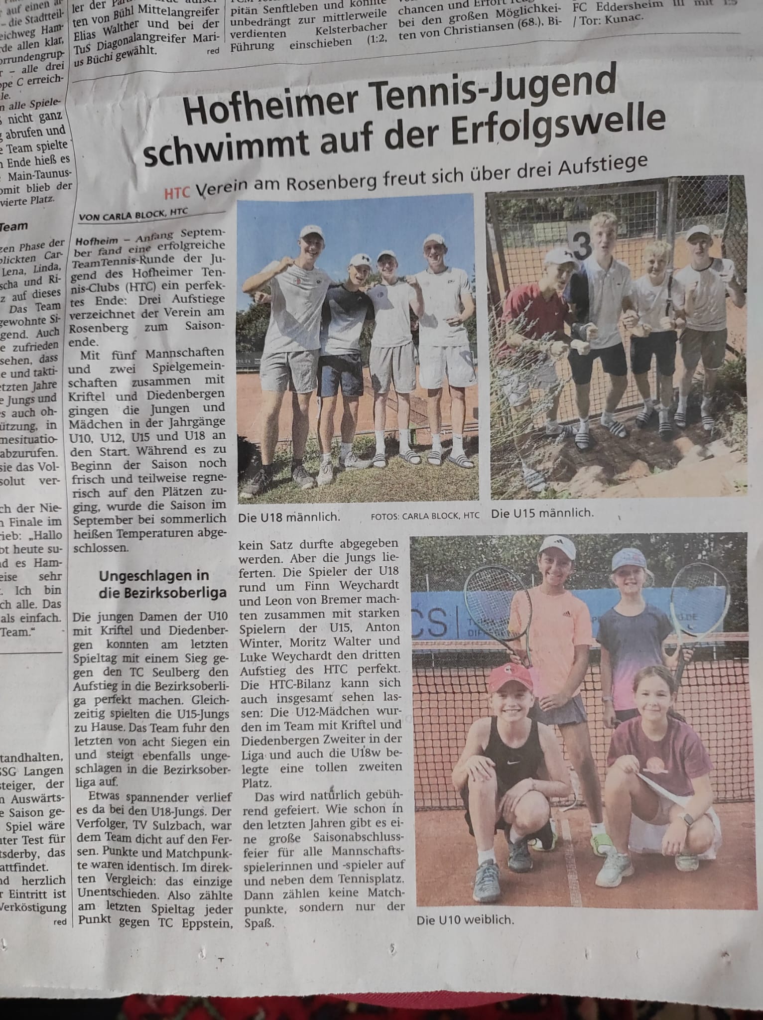 Anfang September fand eine erfolgreiche TeamTennis-Runde der Jugend des Hofheimer Tennis-Clubs (HTC) ein perfektes Ende: Drei Aufstiege verzeichnet der Verein am Rosenberg zum Saisonende.